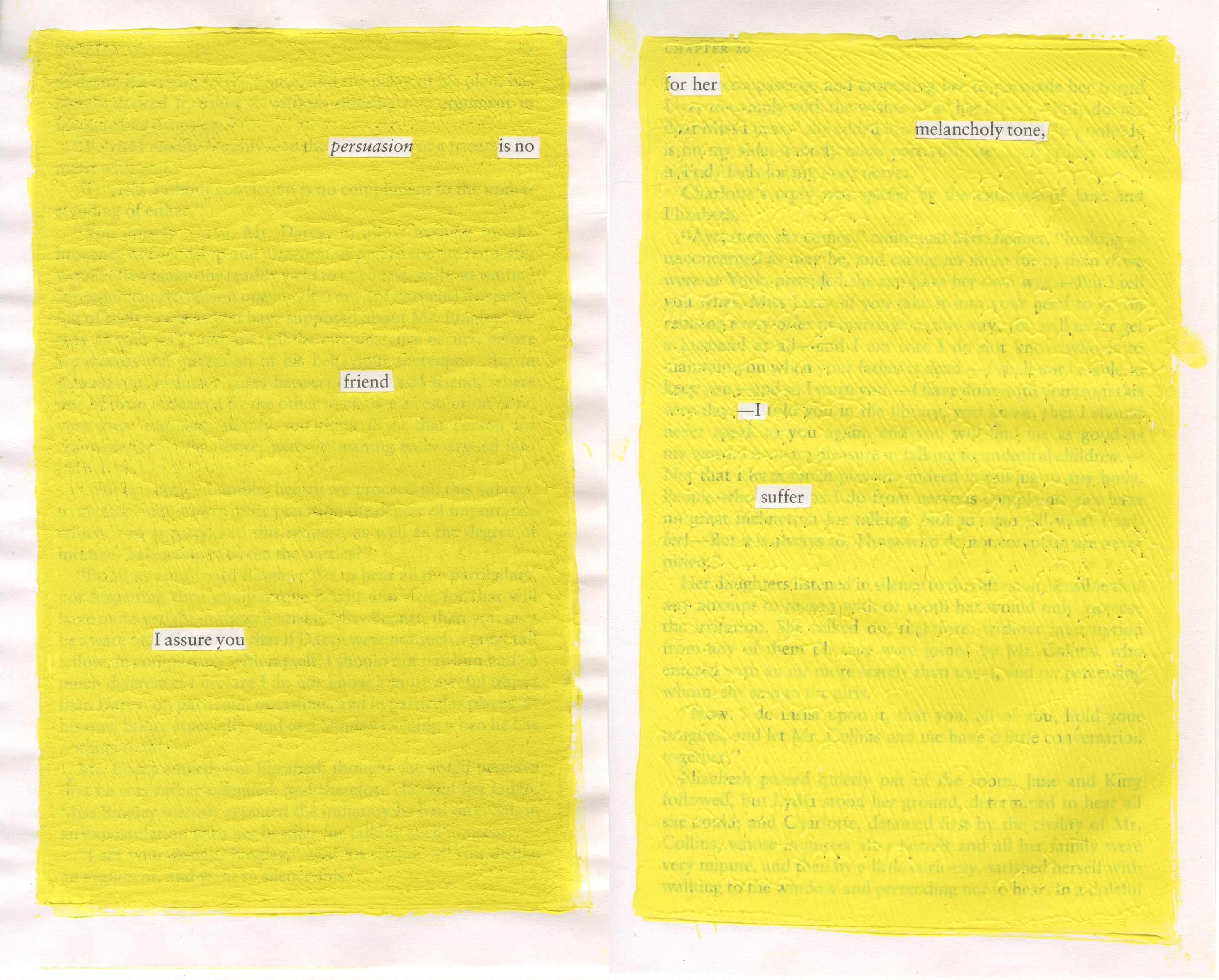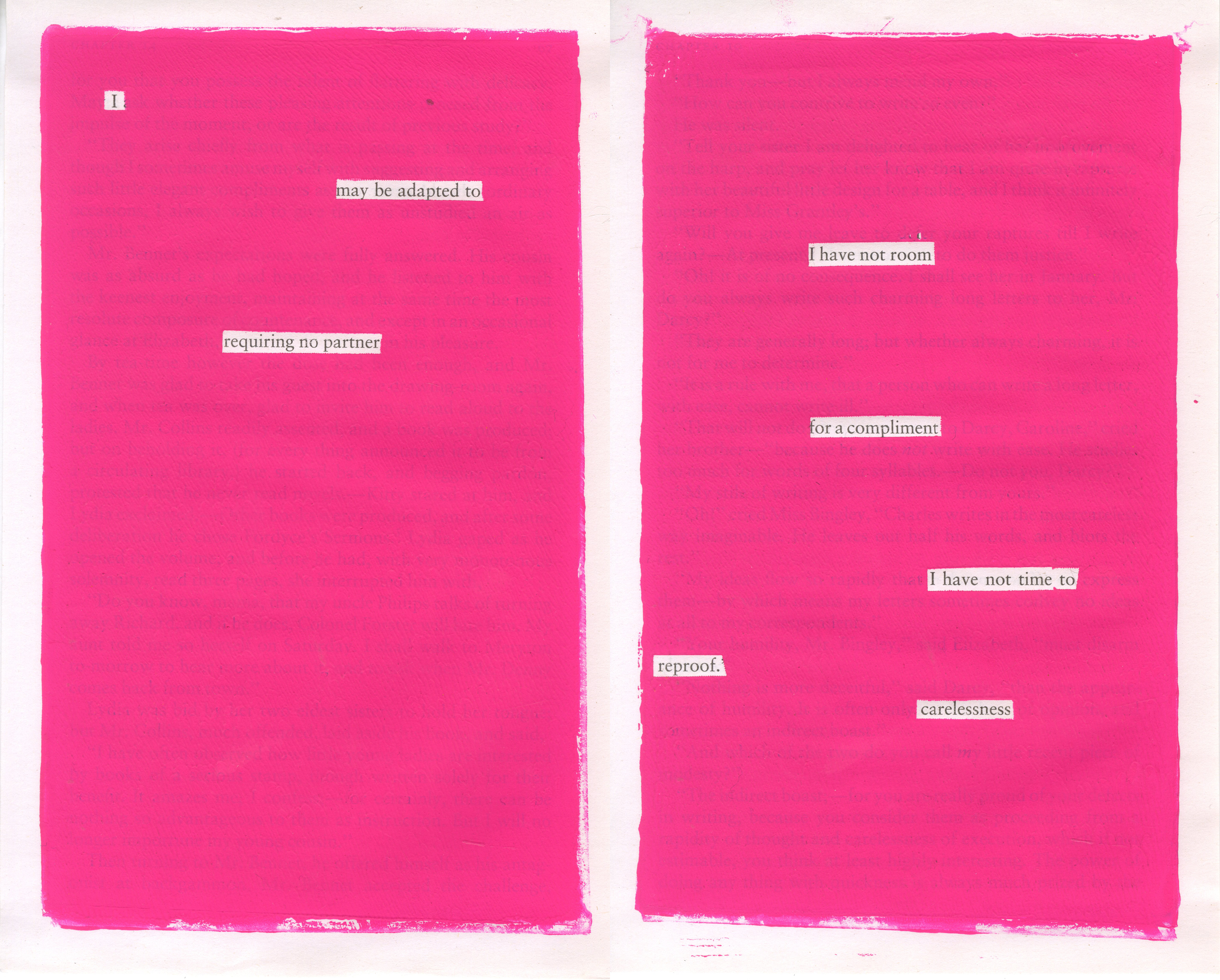 Within this project I used Jane Austen’s Pride and Prejudice as a base text for blackout poems. Austen never married, but declared she would always give her characters a happy ending. I wondered if her books were her method of healing. The poems became a series of stories in which I re-imagine Jane Austen’s love life. One is her story, one is his. The other is their’s.