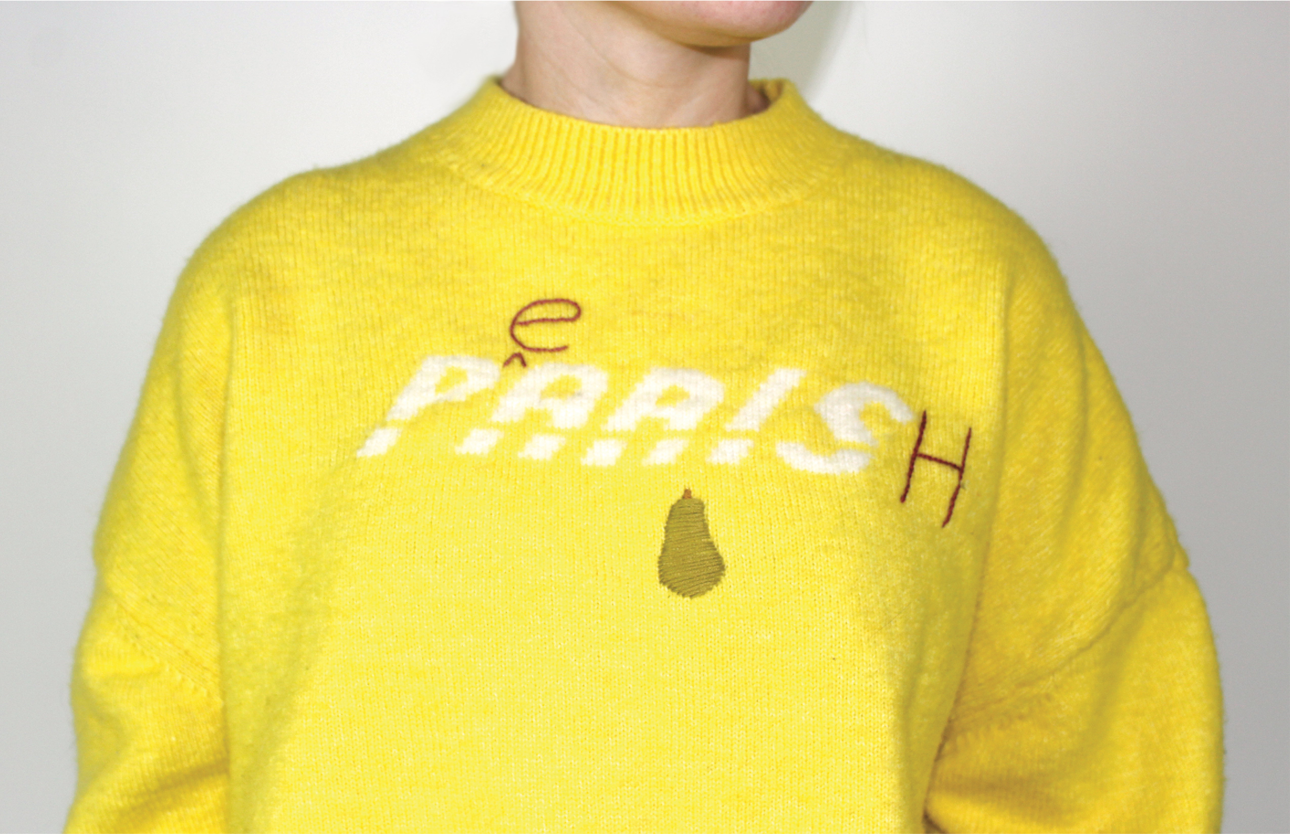 It took a long time to embrace the pear-ness of my body. Recognizing it as strong and healthy and decorating it with not what is in style but what suits it. So this piece was inspired by my own difficulties with body image. From the initial typography of Paris I added an “e” carroted between the “p” and “a”, and an “h” was added to the end. Finally I embroidered a tiny pear beneath the word. My hope is that through declaring the acceptance of my shape, perhaps the other pears, the apples, the triangles, the hour-glasses, and the squares can find the beauty in their own.
