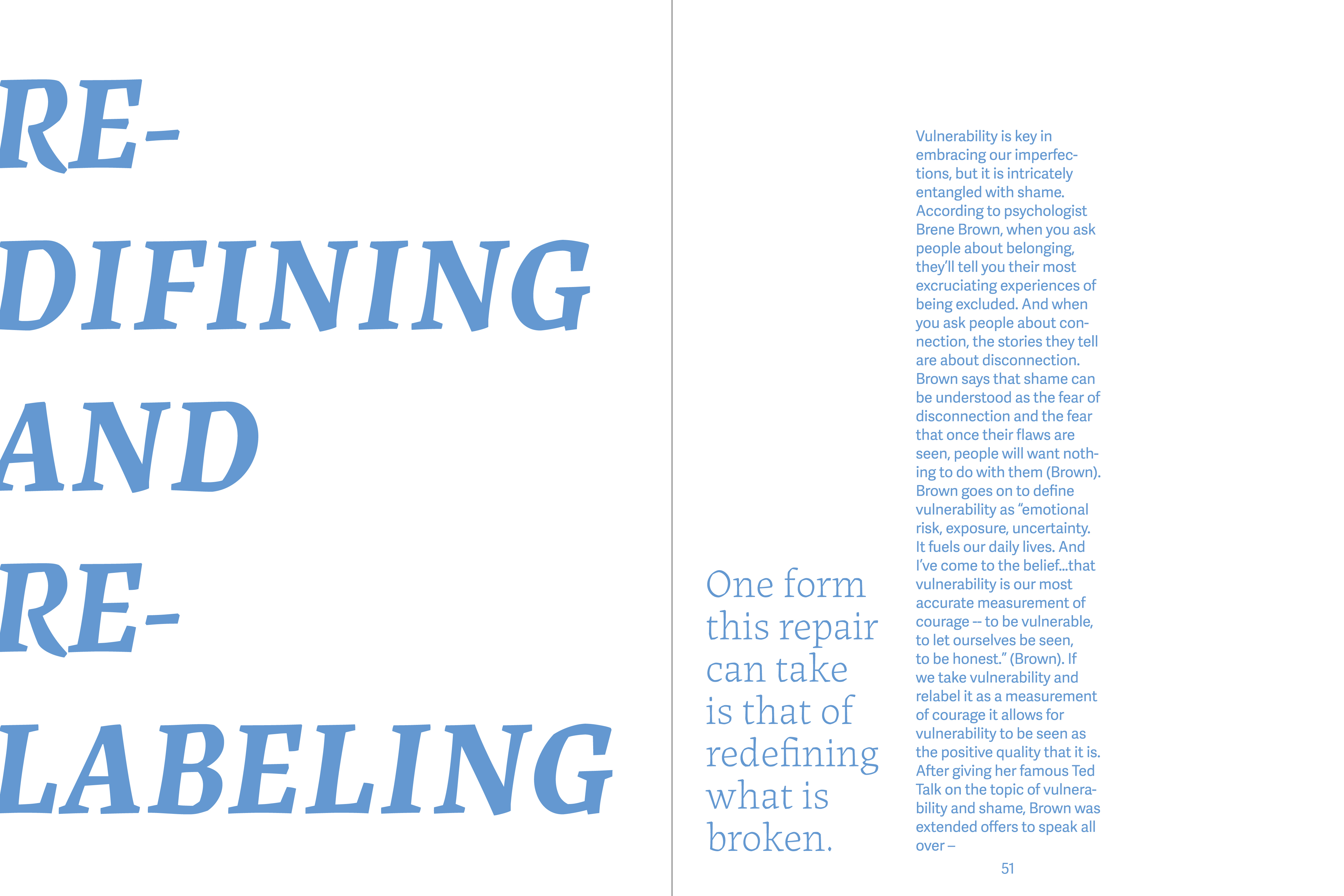 Since the Industrial Revolution, culture, languages and subsequently design, have become increasingly homogenized. In a fast-paced and demanding capitalist society, we strive for ease and efficiency; time is money and perfection is the goal. The misshapen fruit, the slow worker, the broken toaster are brushed to the side by society. Consequently, when we as individuals feel we are damaged or insufficient we work to hide these perceived flaws from the world. The purpose of this thesis is to change societal norms around physical or emotional scars and our perception of our own trauma. In this thesis, I invite the reader to consider feminist strategies, and to reclaim “women’s work” as a slow, methodical simulation of the healing process.